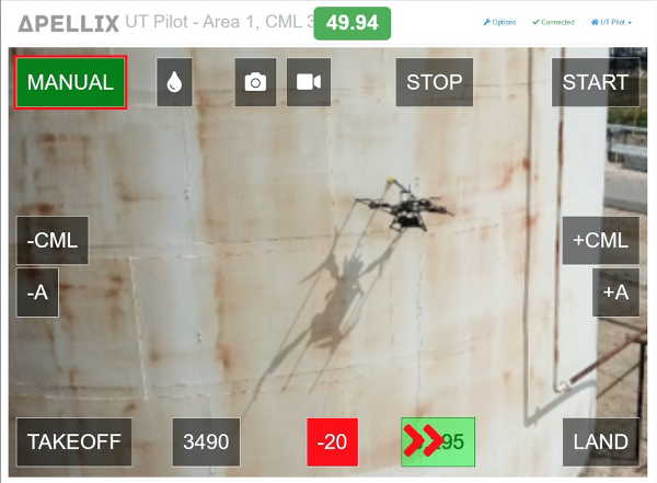 The system then operates under full computer control (no manual input). It flys in (whilst dispensing couplant gel onto the probe), touches the surface, and takes a UT measurement reading, typically taking 1 to 4 seconds, with multiple data points. The aircraft then backs away, the pilot repositions the system at the next location, and repeats the process for additional measurements at different corrosion monitoring locations (CML) or areas/zones
